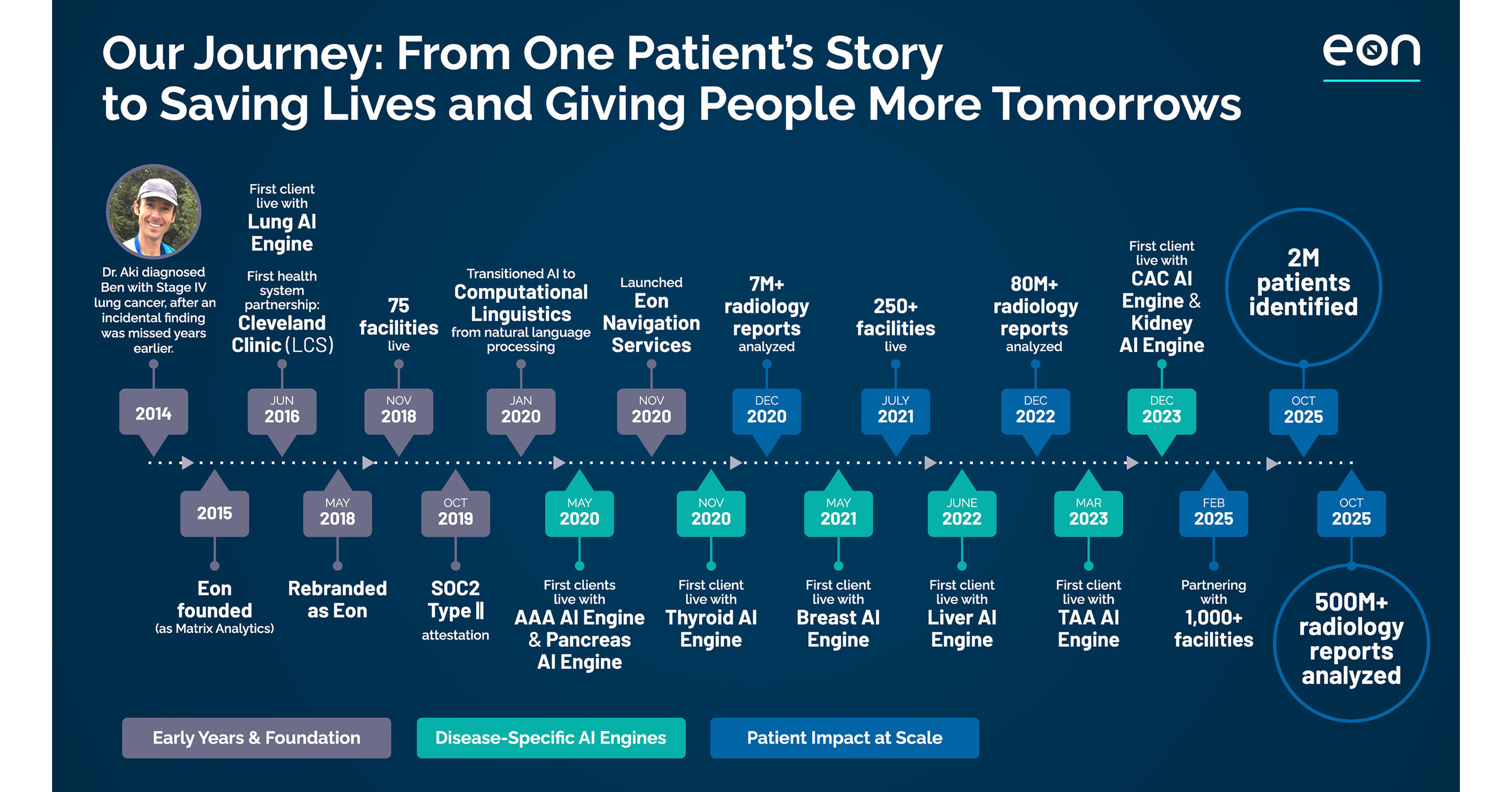 “Our mission is to save lives and give people more tomorrows,” said Dr. Akrum (Aki) Al-Zubaidi, Founder and CEO of Eon. “This milestone represents that mission coming to life, transforming half a billion reports into actionable clinical intelligence that helps incidental findings lead to early diagnosis, not missed opportunities.”